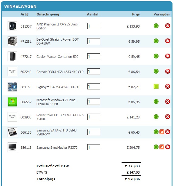 # Product Prijs Subtotaal 1 Asus DVD 18x48 IDE Retail € 15,60 € 15,60 1 be quiet! 750W € 125,65 € 125,65 1 be quiet! Silent Wings USC, 120mm € 12,70 € 12,70 1 Chieftec Mesh CH-01 Zilver, Zwart € 49,95 € 49,95 1 Intel Core i5 750 € 155,60 € 155,60 1 Kingston ValueRAM KVR1333D3N9K2/4G € 79,55 € 79,55 1 Microsoft Windows 7 Professional (NL OEM 64bit) € 108,51 € 108,51 1 MSI P55-GD65 € 127,- € 127,- 1 Western Digital Caviar Green WD10EADS, 1TB € 65,- € 65,- 1 XFX HD 5770 1GB GDDR5 PCI-E € 135,60 € 135,60 Importeren Totaal € 875,16