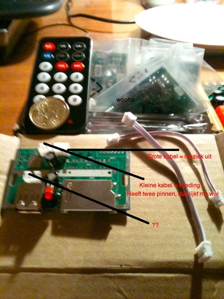 Dat mp3-usb-sd-kaart-ding-device-holder-afspeel-o-matic eh, daar heb ik 2 kabeltjes bij gekregen, enig idee waar die aan moeten? De Brede stekker is voor het audiosignaal denk ik, (er staat L-out, GND en R-out op de pcb) die kleine past maar op 1 plek en is dan voeding denk ik, maar er zit nog een tweede grote contact op het pcb, waar de brede stekker dus ook inpast. (kan even geen foto voor je maken, ben niet thuis)