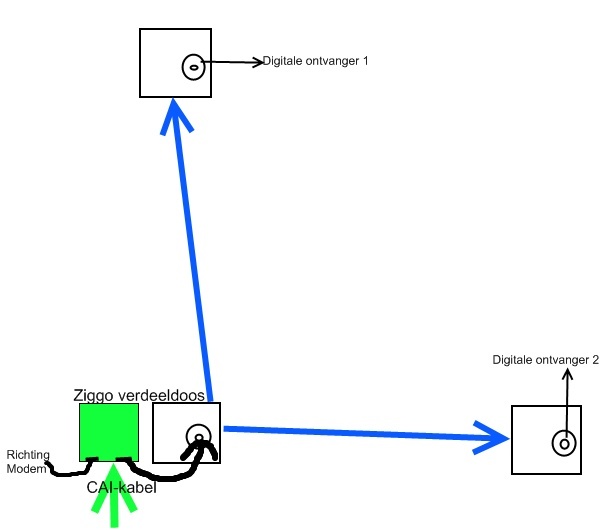 De Cai-kabel komt binnen in een hoek van de woonkamer binnen. De eerste digitale televisie-ontvanger komt echter in een andere hoek van de kamer binnen en de tweede digitale televisie-ontvanger zelfs op zolder. Het verdelen van de kabels hiervoor wil ik allemaal weggewerkt in de muur hebben. Hiervoor wil ik met Hirschmann inbouwdozen werken. Er komt daarvoor een doos in de muur naast de Ziggo-doos waar een klein kabeltje het signaal bij wijze van spreken de muur invoert. Achterin deze doos mag het signaal in 2-en gesplitst worden en richting de andere hoek van de kamer en richting zolder gevoerd worden. Hier moet het dus weer op beide plekken in een doos eindigen. Een en ander heb ik geprobeerd in een tekeningetje te verduidelijken.
