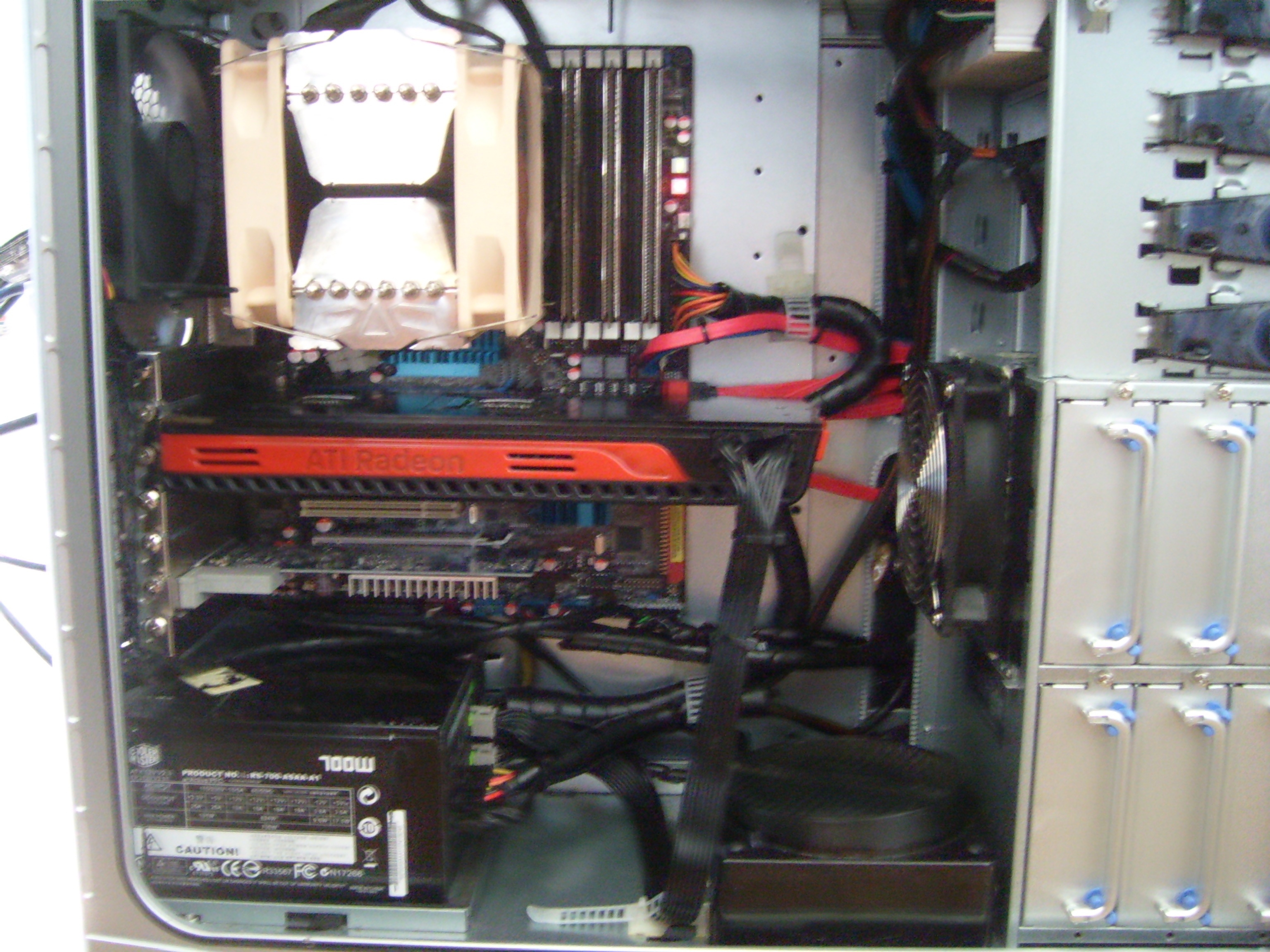 Het gaat hier om mijn gemodde Antec 900, ik heb gaten in de backplate gemaakt om de kabels weg te kunnen werken. Plus heb ik mijn voeding om kunnen draaien.