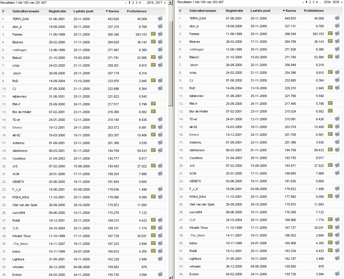 De eerste levert Resultaten 1 t/m 100 van 251.657 op en de tweede Resultaten 1 t/m 100 van 253.487 dus worden de nodige users toegevoegd, maar hoezo verschilt de totale hoeveelheid karma en wisselen users van positie? Het lijkt me dat deze dezelfde waarden zouden moeten geven.
