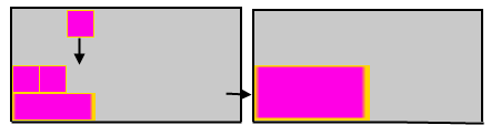 In het linkergrid zie je een beginsituatie. In het rechtergrid zie je hoe het zou moeten. Merk op dat de het paarse blok rechts in twee blokken is verdeeld. Het moet ook mogelijk zijn om blokken te 'mergen'. Zeg dat je eerste een 3x1 blok heb met daarop een 2x1 blok. Het 2x1 wordt niet één rechthoek, want het is te klein. Het 3x1 rechthoek wel. Hierna valt er naast het 2x1 blok een blok. Hierdoor kan het een 3x1 rechthoek worden, maar het moet eigenlijk een zo groot mogelijk rechthoek worden. Een 3x2 rechthoek dus: