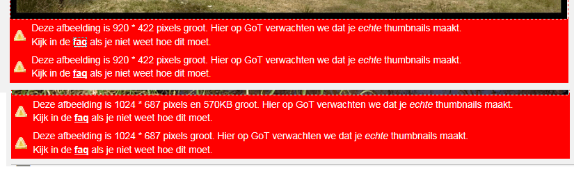 Zou het een idee zijn om de waarschuwing bij het plaatsen van een te grote afbeelding op GoT (de welbekende rode balk met "Deze afbeelding is x*x pixels groot. Hier op GoT verwachten we dat..") alleen aan de plaatser van de post te tonen?