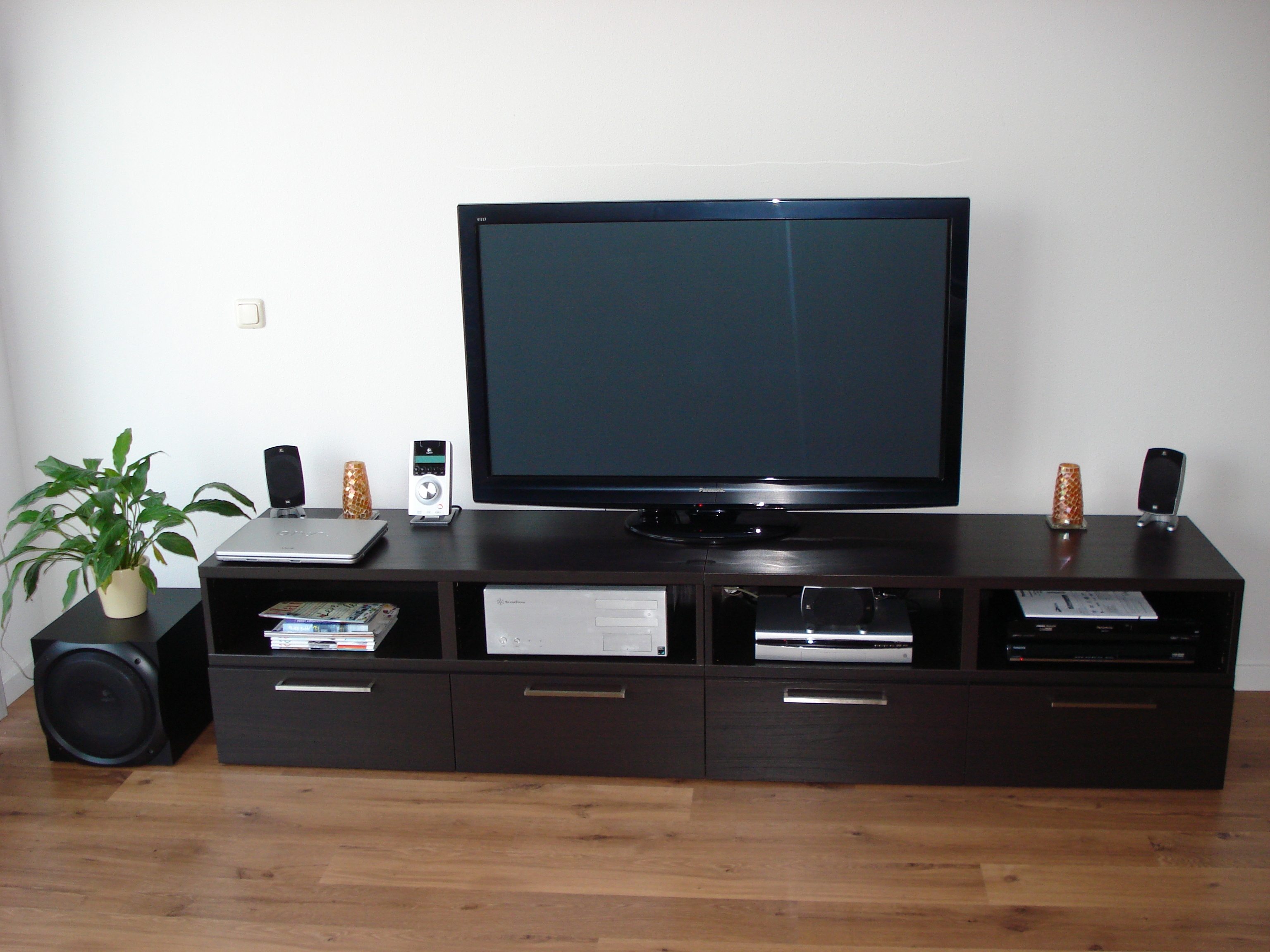 Mijn vorige tv was een kleine philips die mooi in een chinese kast paste, helaas is de 42 inch panna iets te groot hiervoor en maak ik zelf een kast die lijkt op mijn vorige chinese kast, alleen dan wat strakker. Begrijp me niet verkeerd, maar zo'n apparaat als een tv is een lelijk ding (als hij uit staat) en schreeuwt om aandacht. Als uit staat, deuren dicht en er heerst weer een relaxte sfeer in de huis kamer. een grote dichte kast heeft ook het voordeel dat al mijn audio apparatuur incl. platenspeler met platen er mooi in past. laden aan de onderkant passen mooi de cd's en dvd's in. Ontwerp zelf gemaakt in cad en ik heb een tv die zweeft in mijn kast door een beugel. Schitterend! En ik hoor niet bij die 99% die zijn tv of aan de muur of op een laag kastje heb staan. Niks mis mee, maar ik ben graag anders! ;-)