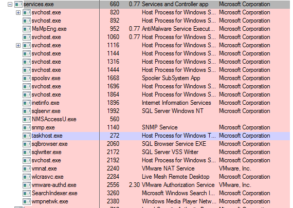 Via Process Explorer kwam ik er achter dat services.exe dan 3~4 GB gebruikt terwijl alle onderdelen bij elkaar nog geen GB gebruiken. Als ik alles kill dan blijft services.exe al mijn geheugen bezetten (en soms de vrijgekomen MB's er ook bij), en ik kan nergens zien wat dat nou precies gegijzeld houdt.