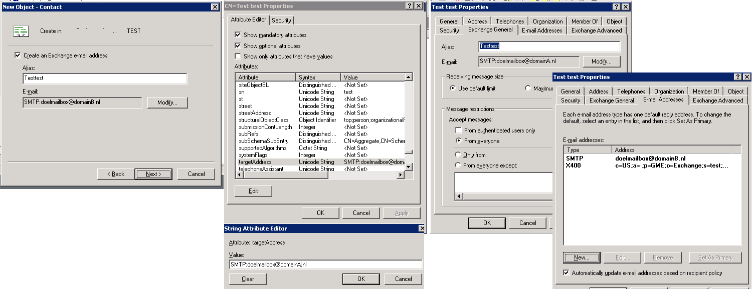 Via adsiedit.msc verander je op je zojuist aangemaakte contact het "targetaddress" attribuut naar het adres van de mailbox op domainA.