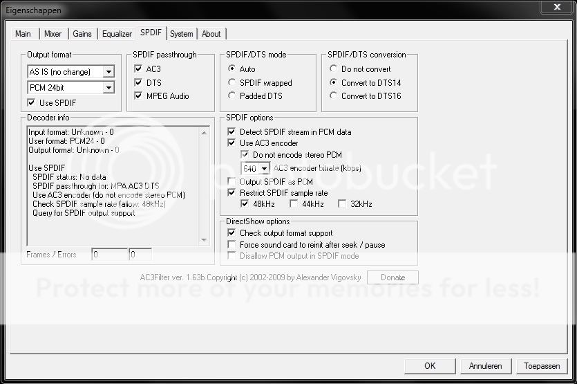Ik heb het combined community codec pack (CCCP) geïnstalleerd en AC3Filter om geluid uit te sturen over S/PDIF naar mijn versterker. Alles lijkt te werken, ik krijg van de meeste van mijn films in allerlei resoluties (720p, 1080i, DVD, etc.) netjes het Dolby Digital of DTS geluidsspoor naar mijn versterker.