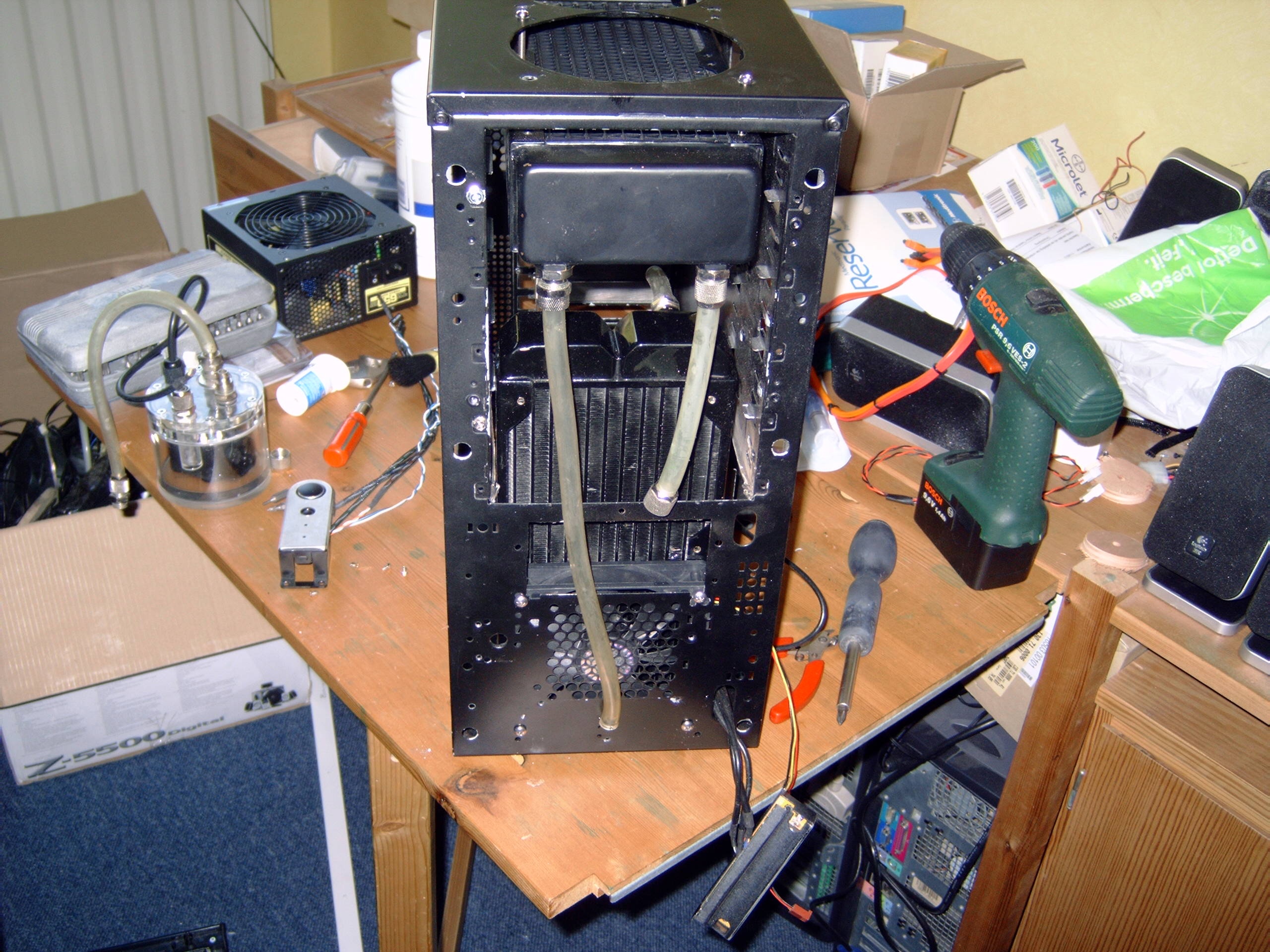 Genoeg over de HDD, nu eens over die radiator, daarvoor heb ik de onderkant uit de cd bays gedremeld, dan gaatjes geboord en de rad er tegenaan gezet.