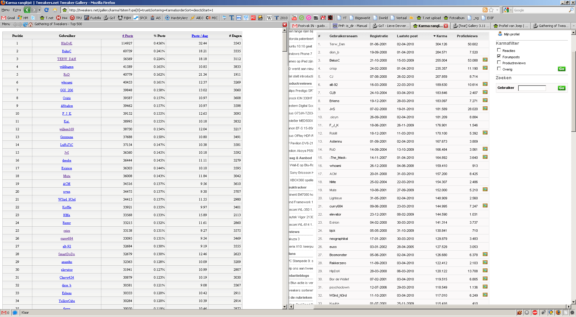 Ik volg en begrijp je redenering helemaal. Zo ver ik weet is die feature nooit ingebakken omdat we niet willen hebben dat gebruikers een run gaan maken om maar zo hoog mogelijk in de statistieken te eindigen, vandaar dat top-500 van gebruikers met de meeste forumposts alleen met wat zoekwerk te vinden is. Het gaat er ons niet om dat je zo hoog mogelijk in de stats staat, maar dat je meer zogenoemde techposts (reacties in de core-fora van GoT) maakt. En hoe meer aandacht je besteedt aan je reacties in die fora, des te hogere score krijg je van de karmaberekenaar. Niet de ideaalste oplossing, maar wel van gewicht is om gebruikers kwalitatieve reacties te laten posten.