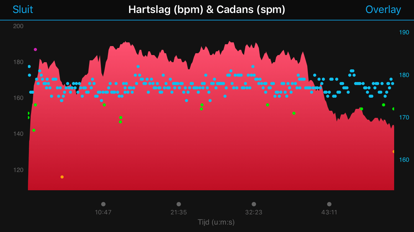 Zie plaatje hieronder (klik voor groot) voor mijn cadans + hartslag gedurende de gehele loop. Ook niet helemaal één op één...
