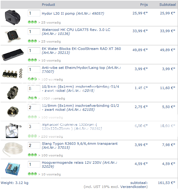Fans, etc. kom ik zelf wel uit. Reservoir ben ik van plan om zelf te gaan maken. Ik heb er nog geen kast voor, maar dat gaat me ook wel lukken. Ik zit meer in over de slangdikte, fittingen, highflow/lowflow, etc. Dus als jullie me zouden kunnen vertellen of deze setup gaat werken, en of er betere alternatiefen zijn, of ik ergens beter wat meer geld aan uit kan geven hoor ik het graag