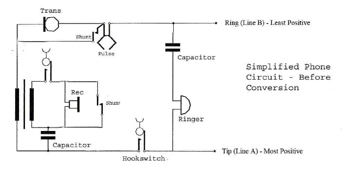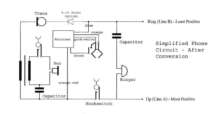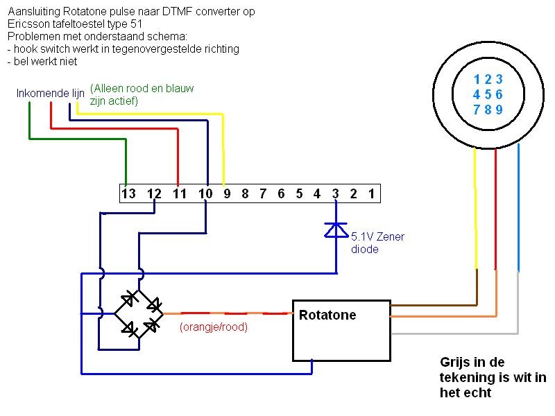 Ik heb een schema van hoe de Rotatone aan moet worden gesloten op een 'simplefied phone circuit' en heb een aantal schema's van mijn telefoon zelf. Deze twee schema's naast elkaar leggen zou uitkomst moeten bieden. Helaas zijn natuurlijk niet alle telefoons identiek en loop ik een beetje vast. Een aantal zaken heb ik wel uit weten te vogelen maar daar ben ik er helaas nog niet helemaal mee.