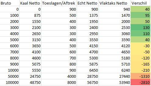 Uiteraard kan er aan de getalletjes getweakt worden. In dit geval gaat iemand die bruto €100.000 per maand verdient er netto €2810 per maand op achteruit dus perfect is het nog niet maar het principe is denk ik wel duidelijk? Je ziet dat er in het midden niet zo veel verandert, t/m €5000 bruto per maand gaat men erop vooruit...