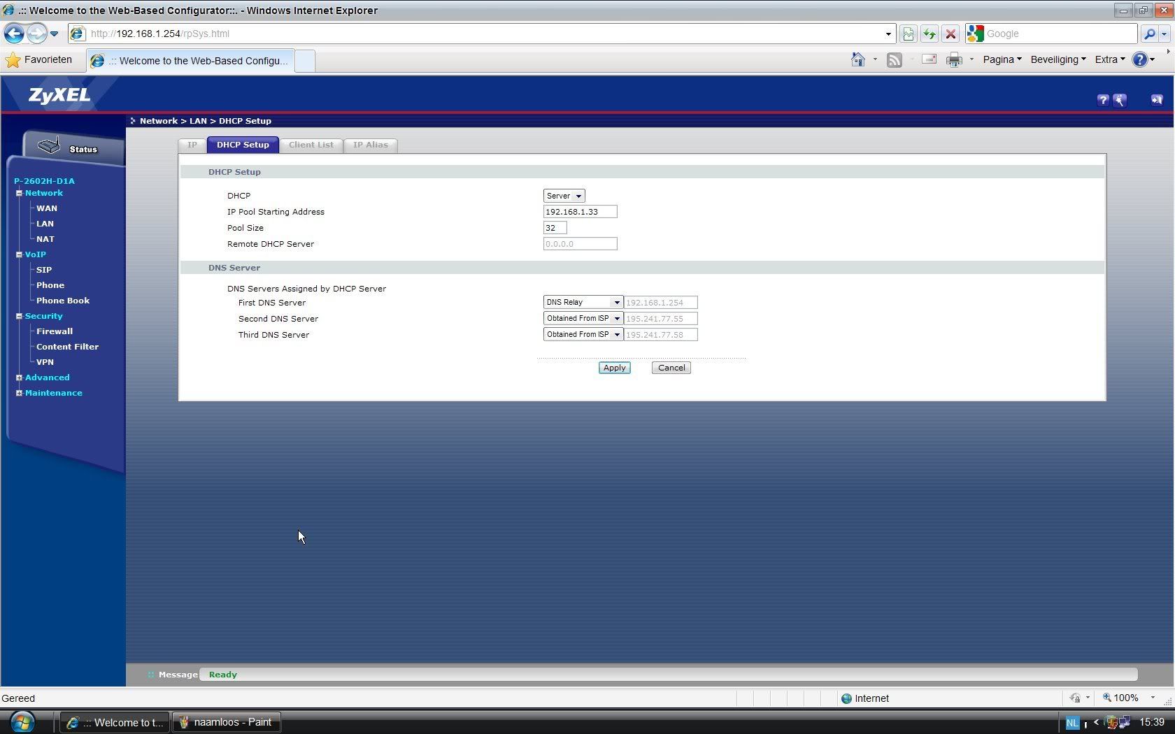 Ik heb DHCP uitgezet, zyxel IP erin gezet en is volgens mij gelukt.