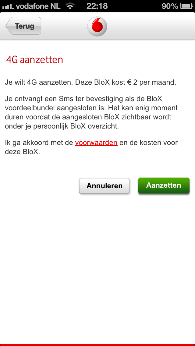 Nou zag ik zojuist in de My Vodafone App dat ik 4G kan aanzetten voor €2 per maand; wel jammer er geen landelijke dekking van 4G op 1800MHz komt.