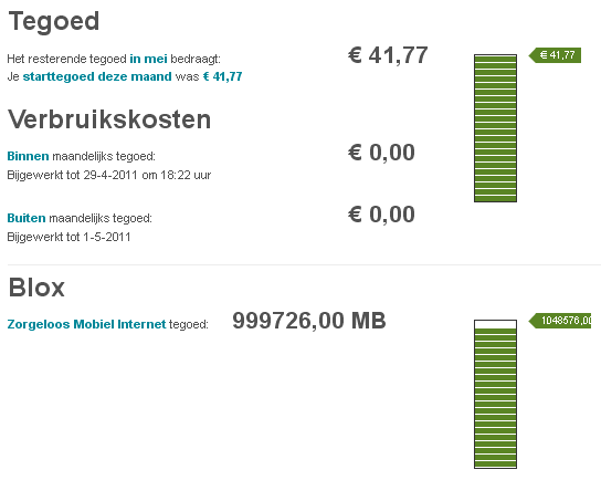Naar aanleiding van je post ben ik eens gaan kijken op vodafone en heb ook opeens zo'n meter en het ziet er verder het zelfde uit, ook volgens de meter niets over. Wanneer ik precies had verlengt weet ik zo niet maar in ieder geval al lang voor de datalimiet ter sprake kwam. Volgens netcounter zit het dataverbruik de afgelopen 11 maanden rond de 1 a 1,5Gb/maand. Het zal wel een foutje zijn maar wel iets om ff in de gaten te houden dusWebhawkjuh schreef op zondag 01 mei 2011 @ 21:33: