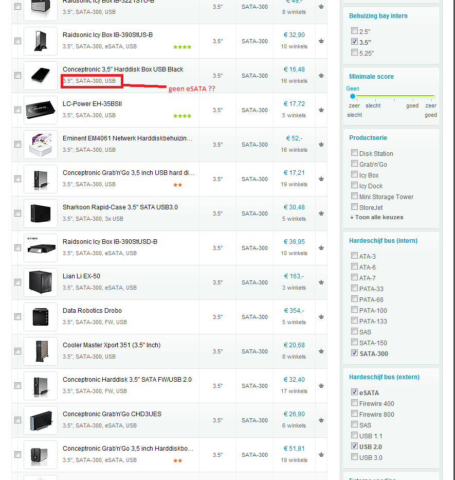En hij laat nu ook casings zien die wel USB hebben, maar geen eSATA. En dat klopt volgens mij niet.