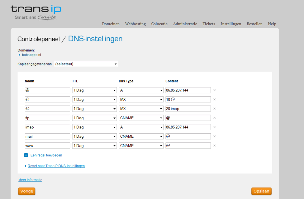 <DNS instellingen voor domein - Klik op thumbnail voor groter plaatje>