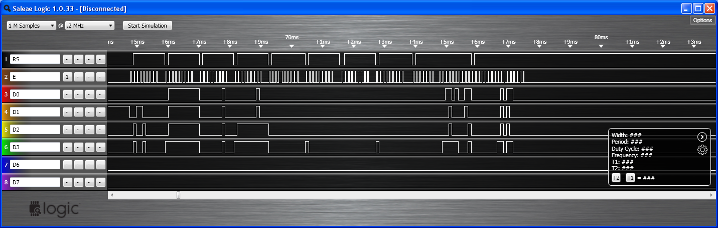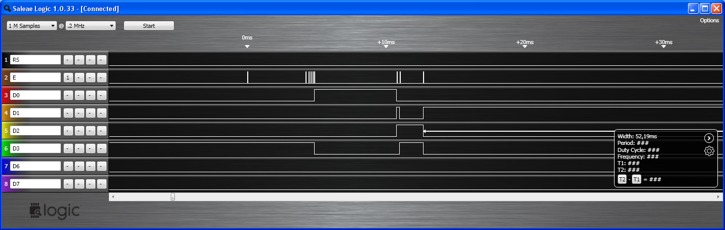 Ik heb de logic analyser bij de hand genomen en meetprobes bevestigd de aansluitingen van het LCD.