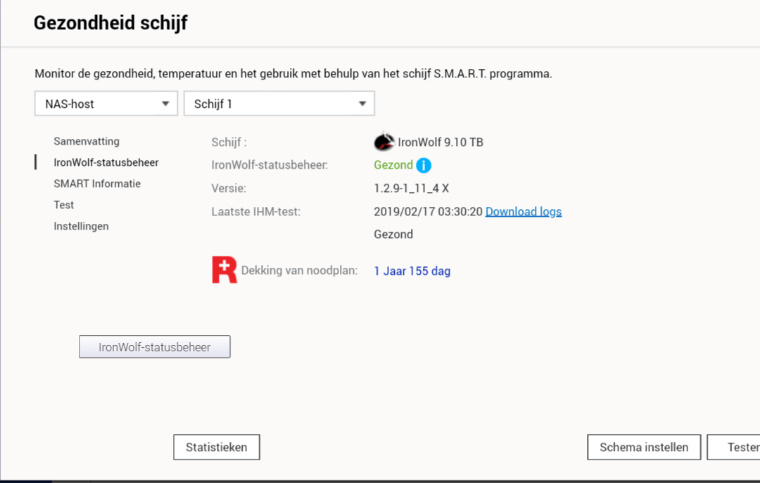 De nieuwe schijf komt uit de Seagate Ironwolf-serie, die door de QNAP volledig ondersteund zou moeten worden. Echter lijkt de Ironwolf Health Monitor niet te werken... Het wordt herkend, maar geeft een fout: