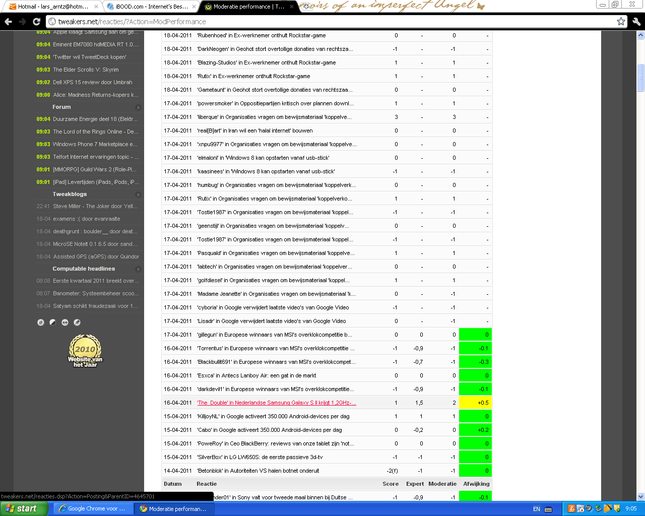 De moderaties worden in de Moderatie Performance anders afgerond als op de frontpage waar de reactie zelf is geplaatst. In de Mod Performance kreeg de reactie een score van 1,5. Op de frontpage een score van 1,4. Er waren 6 moderaties van +2 en 9 van +1. Totaalscore is 21. 21/15=1,4 (exact)