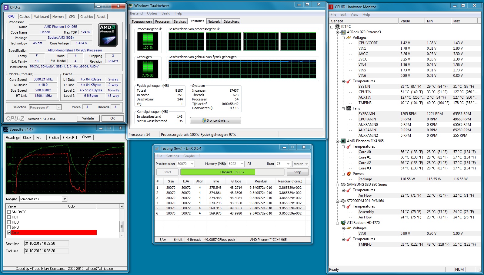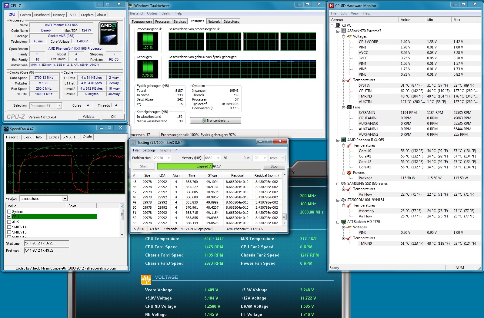 De CPU temp (en dus niet de coretemp) is max 62°C met een kamertemperatuur van 21-22°C. Verder heb ik de CPU-NB verhoogd. Eerst had ik 2800 MHz geprobeert, maar deze gaf met 1,2875 V na een een paar minuten LinX al een BSOD dus daar ben ik niet mee verder gegaan. De 13×200 = 2600 MHz op 1,2500 V was wel stabiel. Ik kreeg bij een stapje lagere voltage van 1,2375 V voor de CPU-NB een paar minuten voor 5 uur LinX een error...