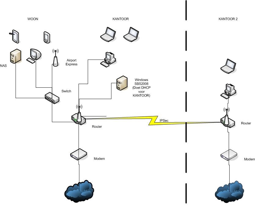In de kantooromgeving staat ook nog een Windows SBS2008 server welke een middels de kantoor router een VPN heeft naar een kantoor2 netwerk op een andere locatie. In de woonomgeving staat nog een NAS met (Fedora), hierop wordt vanaf buiten via ssh ingelogd (en deelt bestanden in de woonomgeving).