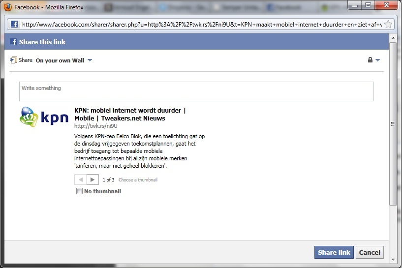 Nu heeft het sharen voor mij geen zin omdat de boodschap die ik wil sharen (KPN gaat géén Whatsapp-heffing invoeren) er niet staat.KPN: mobiel internet wordt duurder | Mobile | Tweakers.net Nieuws