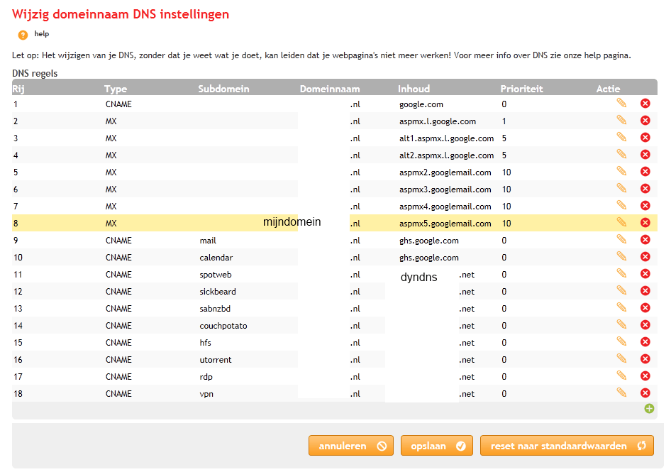Ik heb nu ook wat cname verwijzingen toegevoegd om dingen zoals spotweb.mijndomein.nl naar mijn Spotweb site te laten verwijzen. Nu wil ik ook graag mijndomein.nl en www.mijndomein.nl laten verwijzen naar mijn site, dit wil ik doen door het te koppelen aan mijn dyndns url, net als ik Spotweb heb gedaan. Echter zodra ik een cname aanmaak voor een van die twee krijg ik geen e-mail meer binnen. Ik vermoed dat het komt doordat bij een lookup dan al het verkeer automatisch naar mijn dyndns gestuurd wordt en er niet meer naar de MX gegevens gekeken wordt. Hoe kan ik hier nu omheen werken?