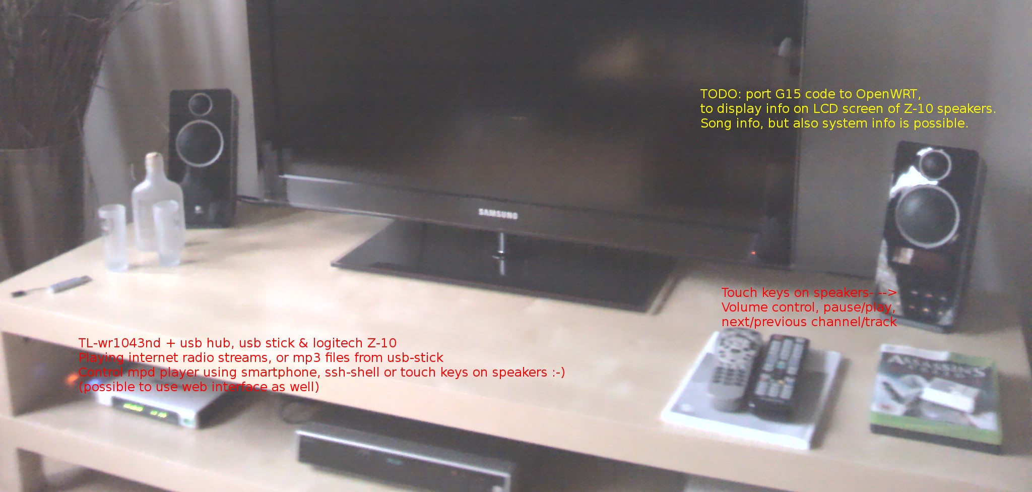 En zoals ik al zei, die software is er allemaal, het is vooral een kwestie van compileren voor de architectuur van de router. Ze staan voor niet al te veel op marktplaats, nog iemand zin in een projectje? Moest ik dat lcd werkend krijgen, zou ik direct een 2e set speakers komen, zodat ik een set voor mijn pc en een set voor aan de "internet-radio" heb.