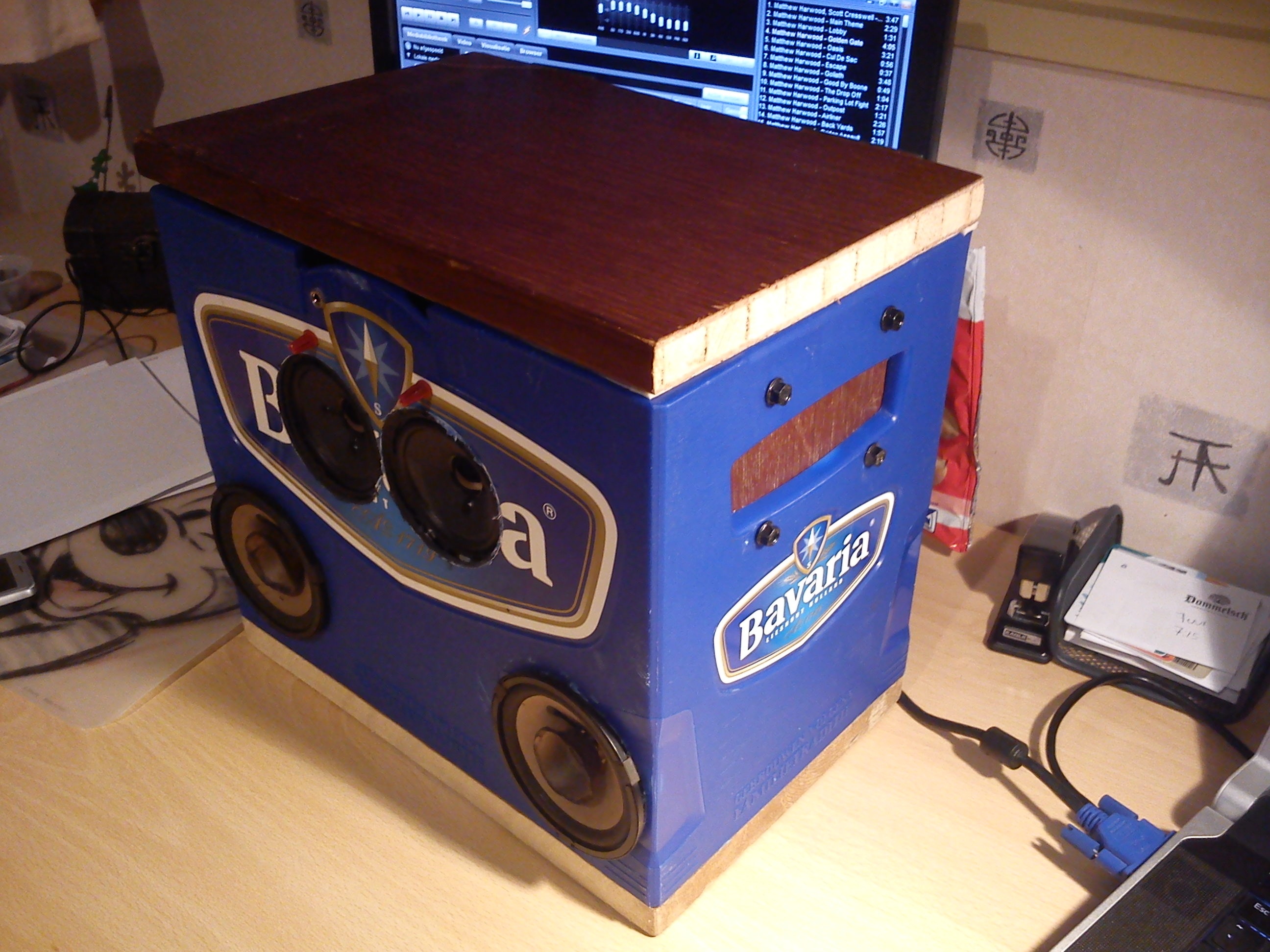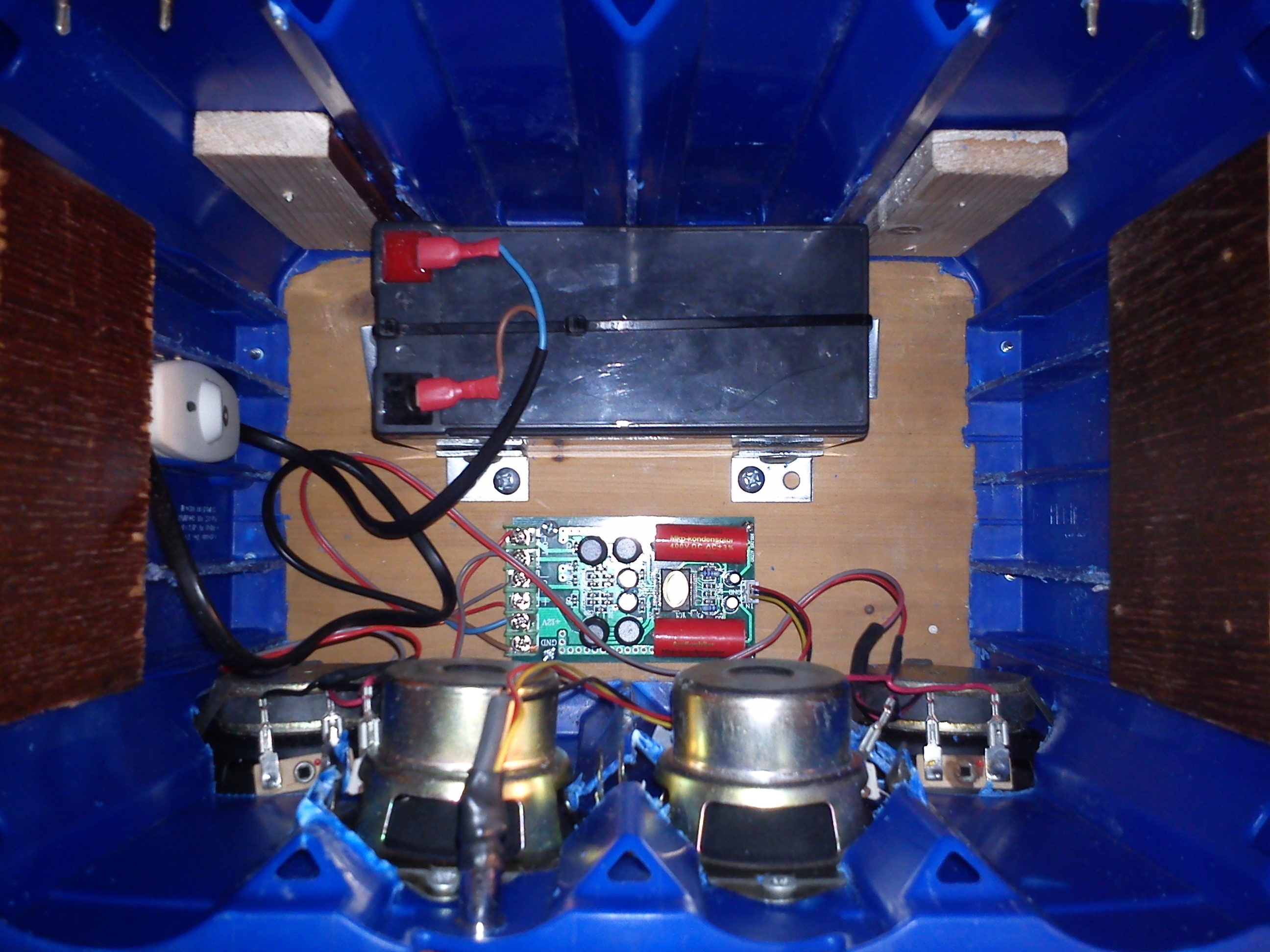 Er komt nog wel een redelijke bas uit maar met de accu uit de krat is deze uiteraard beter. Misschien dat ik ooit nog een bak eronder zet met de accu in en dan het geheel op wielen zet. Ik ga eerst deze zomervakantie afwachten wat alles geeft.