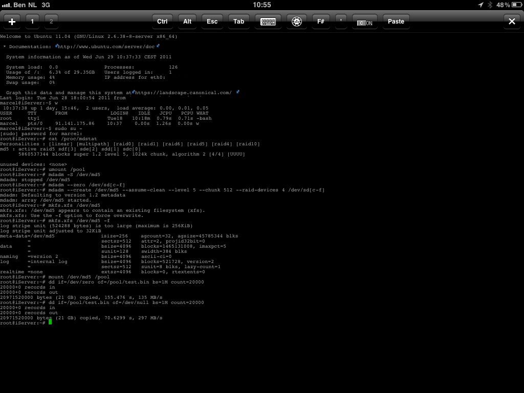 Ik heb hierop Ubuntu 11.04 Server geinstalleerd. Nu wil ik met mdadm de 4x 2TB in raid 5 zetten.