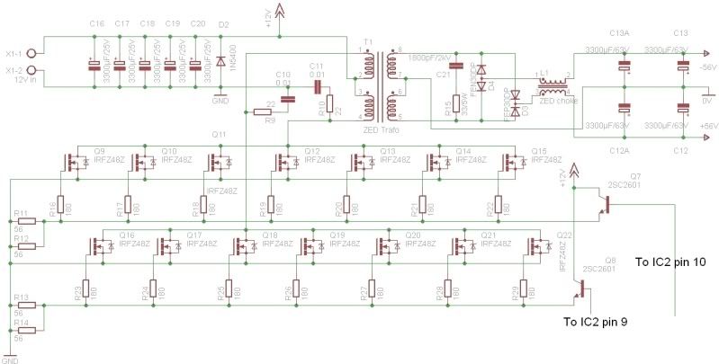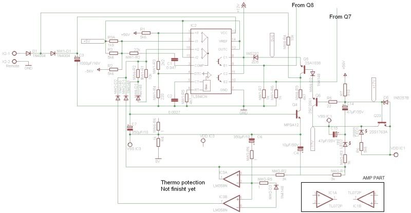 Vermits ik de PWM ic (TL594) gedesoldeerd (evenals diodes en de grote afvlak elco's na het ontstoor spoel) had moest ik dus een nieuwe gaan halen (TL494 is dezelfde alleen iets anders aan) en deze op een ic voet erin gezet, versterker terug aangesloten op 12V voeding en nada nog steeds geen 56V op de 56V lijn. De amp doet nog steeds raar.