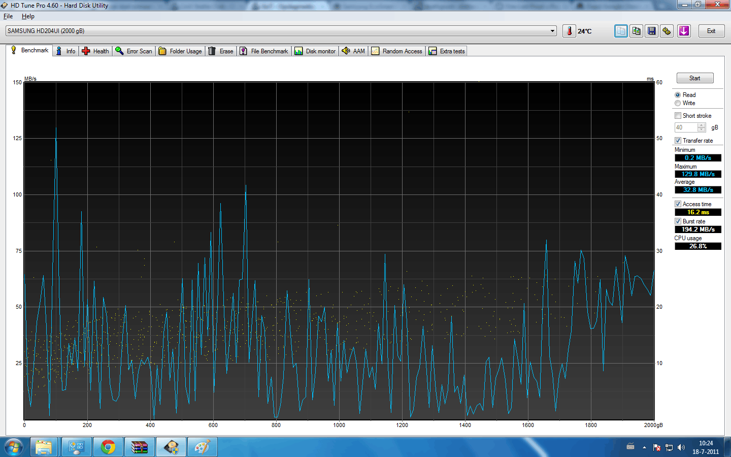 en de leessnelheid. Hier ben ik van geschrokken, ik heb diezelfde test ook gisteravond gedraaid, en toen kreeg ik max 130MB/s, gemiddeld 115. Dat haal ik dus nu bij lange na niet. 32 MB/s is iets totaal anders. Heeft iemand hier een verklaring voor?