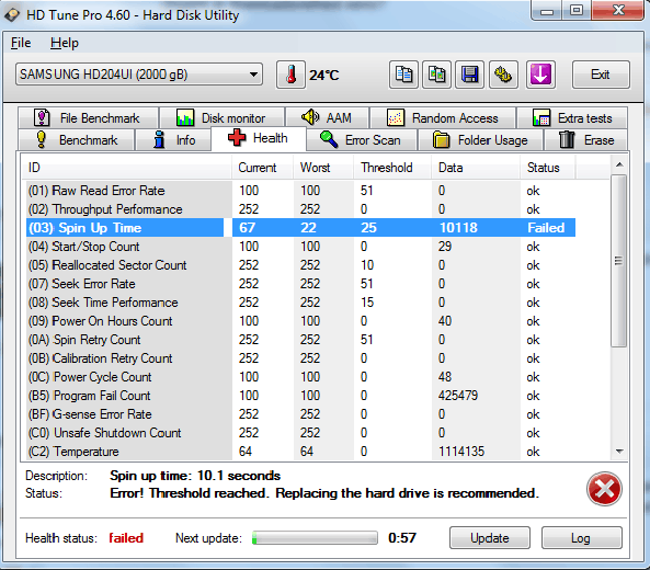 Ik heb een probleempje met mijn gloednieuwe Samsung spinpoint F4EG HD204UI 2TB. Ik heb hier twee exemplaren van, waarvan een in een ubuntu sever, een in een windows 7 computer. Beide vertonen hetzelfde probleem, namelijk een veel te hoge spinup time. Momenteel is die in windows zo'n 10 seconden, maar in ubuntu is die zelfs 20 seconden geweest en tijdens opstarten krijg ik vaak de melding dat het apparaat nog niet klaar is. Hier een screentje van de error zelf: