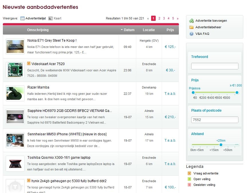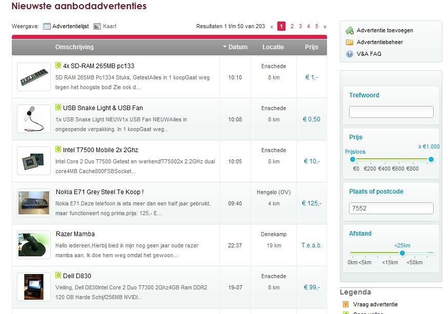 Wanneer ik postcode + afstand optie gebruik op VA, en deze instel op 25km zie ik de advertenties in mijn regio (screenshot links). Klik ik op een willekeurig advertentie en vervolgens terug (back-button browser) en speel ik nogmaals met de afstand maar set ik deze weer op 25km krijg ik doodleuk een ander lijst (oud) te zien (screenshot rechts)
