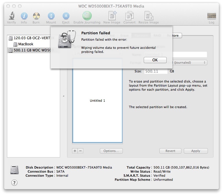 Ik wil 2 nieuwe partities maken die allebei Mac OS Extended (Journaled) geformatteerd zijn. Als ik dat doe krijg ik onderstaande melding te zien :Daedalus schreef op donderdag 21 juli 2011 @ 23:49: