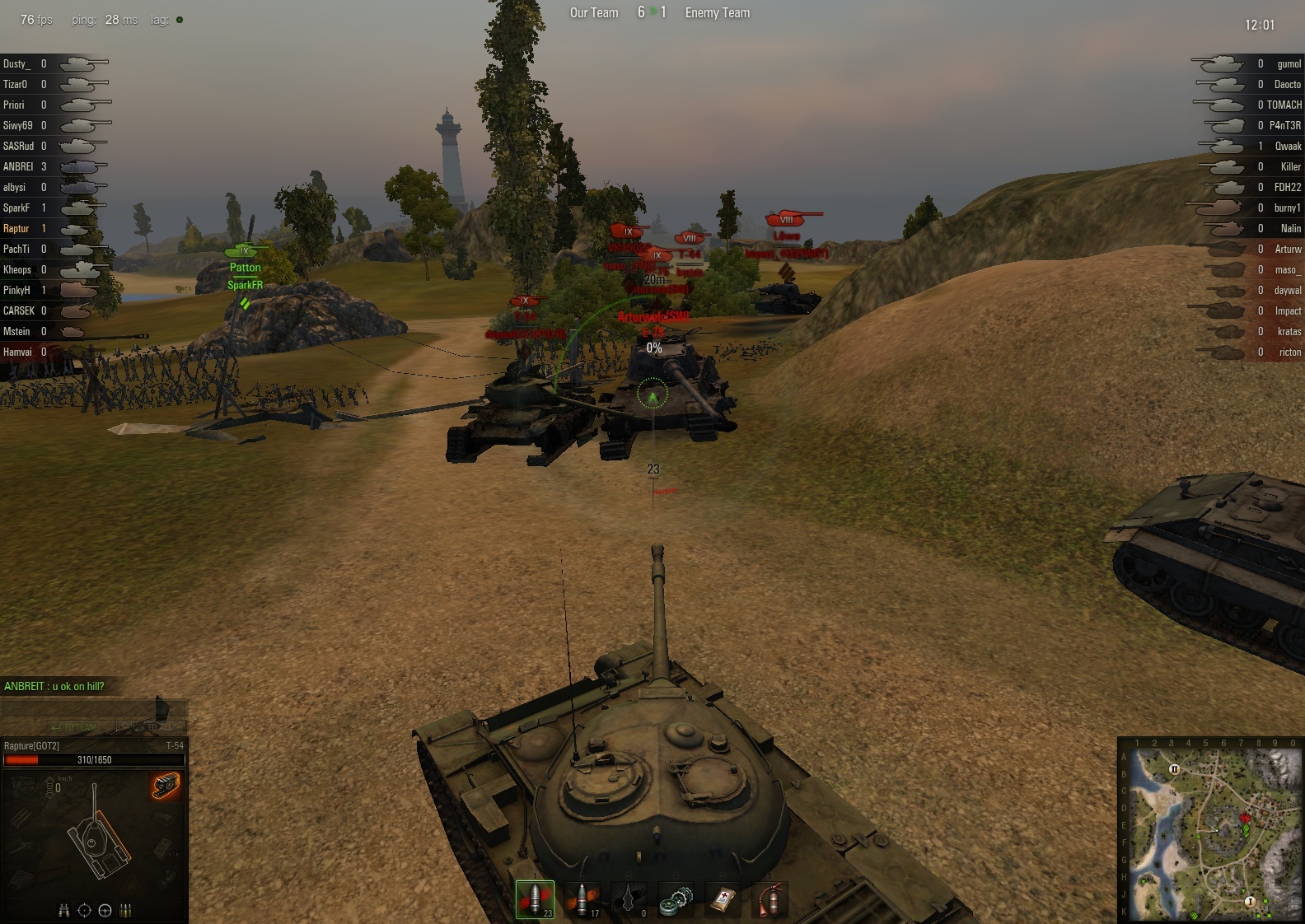 Ik begon in het zuiden van Mines en ging snel de heuvel op. Ik detrackte een T-54 en die werd door mijn team op afstand gepakt. De vijandelijke mediums schakelden direct in achteruit. Ik kon aimed en hull down rustig naar hun peekaboo pogingen kijken. Zij met volle aandacht naar mijn team en ik in de zijkant.