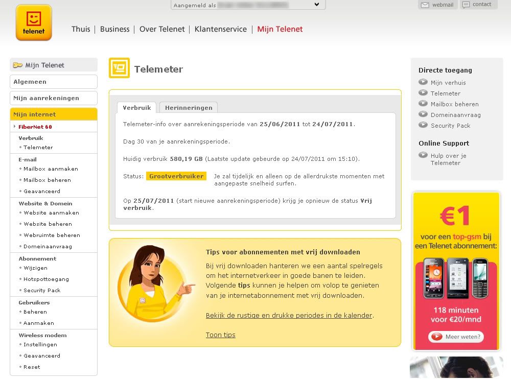 ik ben een klant van telenet en heb fibernet xl. dit houd in dat je onbeperkt kunt downloaden aan 100mbit/s over de glasvezelkabel. nu heb ik vandaag tijdens het surfen een bericht gekregen dat ik moet oppassen of ik word bij de grootverbuikers gerekend. ik begrijp wel dat ze liever hebben dat we snachts downloaden en dat dat vrij downloaden niet echt betekent dat je zoveel kan downloaden als je wilt. maar het is wel vrij irritant om al na 11 dagen telenet deze melding te krijgen. zijn er hier nog mensen met dit probleem?