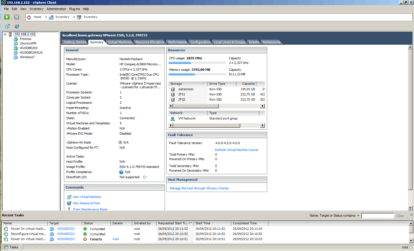 ESX is zelf geinstalleerd op de SSD die erin zit en dat draait prettig. Misschien dat ik dat ooit nog op een USB stick zet maar voor nu is het prima. Verder staat de Windows 7 client, SQL Database en de swap files op de SSD dus de prestaties daarvan zijn prima. Ik heb nog niet veel gemerkt van degradatie van performance (vziw ondersteunt ESXi geen trim commando) Ik ben wel benieuwd of dat zo blijft, maar dat ga ik meemaken