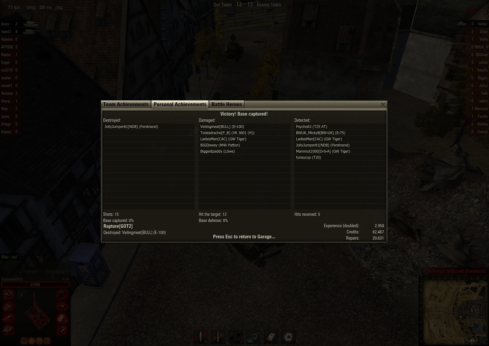 Wel nog een leuke pot gehad op Lakeville of hoe noemt dat ding weer. Aan het pleintje achter de kerk eerst wat schoten heen en weer totdat alle mediums kaput zijn. Dan ga ik naar voor om te ontdekken dat er nog 2X IS-3 en 1X IS-4 over zijn. We hadden allen nog zowat 400HP over. Dus allemaal te one shotten. Ik steek me weg achter wag mediumwrakken. Al wat ze moesten doen was samen aanvallen. Maar eerst kwamen ze per twee. schiet ik direct de eerste kapot eens hij voorbij de wrakken kwam. De tweede probeerde tussen de wrakken in te schieten en raakt me op 5° natuurlijk een ricochet. Ik schiet er dan ook tussen, recht op zijn loop. De derde intussen doodsbenauwd stak zich goed weg en wachtte op mijn eerste schot. Hij zou niet eerder komen en hij had het voordeel. Ik had dus één schot, ik reed 2m ofzo achteruit en zijn commanderhatch was perfect binnen bereik, kaboom