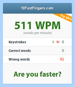 Ik zit atm op 83wpm maar na een dag devven of anderszins keyboard-capen moet ik veel hoger uitkomen. Op een brakke zondagavond met random woorden i.p.v. zinnige zinnen kom ik, klaarblijkelijk, dus uit op 83wpm.