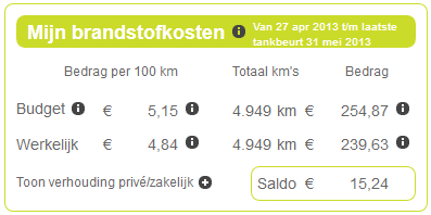 Omdat ik dus goedkoper tank, is het bedrag wat ik kwijt ben aan brandstofkosten per 100KM dus eigenlijk lager uitgevallen (ondanks dat ik onzuiniger rij). Dat betekent in dit overzicht dat ik dus 15,24 euro terug krijg.