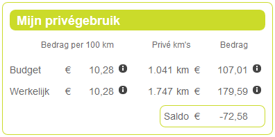 In onderstaande afbeelding zie je dan hoe dit qua kosten wordt verrekend. In mijn budget zat tot op heden 1.041 privékilometers, maar ik heb er dus 1.747 gereden. Voor die twee staat een bepaald bedrag wat gebaseerd is op de prijs die eerder is genoemd. Je ziet dat ik op dit moment dus 72,58 bij zal moeten betalen. Rijd ik de komende weken niets privé, dan zal dit bedrag dalen, aangezien ik elke dag ~27KM bijgeschreven krijg bij mijn 'Budget'. Ga ik veel meer privé rijden, dan zal dit bedrag vanzelfsprekend stijgen.
