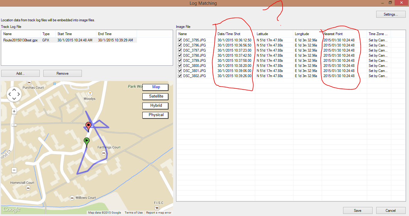 Weet je zeker dat instellingen aan alle kanten hetzelfde zijn? Want ik zie b.v. in je screendump een afwijkend datumformaat; d/m/y versus y/m/d. Wellicht dat daardoor de 'matching' van de GPS points de mist ingaat? Of door andere incompatibele settings oid?