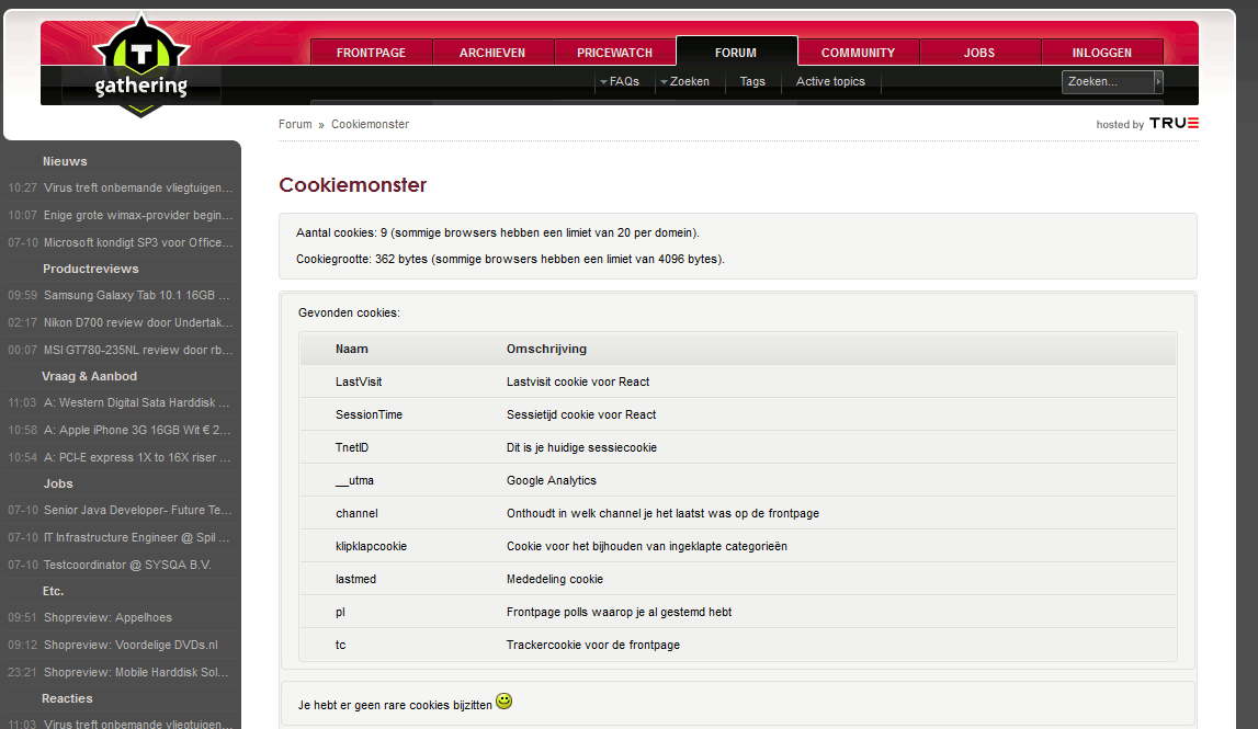 Er staat dus een (valid?) TnetID en die is ook bereikbaar voor de site (zie cookiemonster). Alleen wordt ik toch niet ingelogd, terwijl ik de sessie de keer ervoor niet expliciet heb afgesloten. Dat vond ik vreemd en daarom leek het mij niet persé een browser probleem.