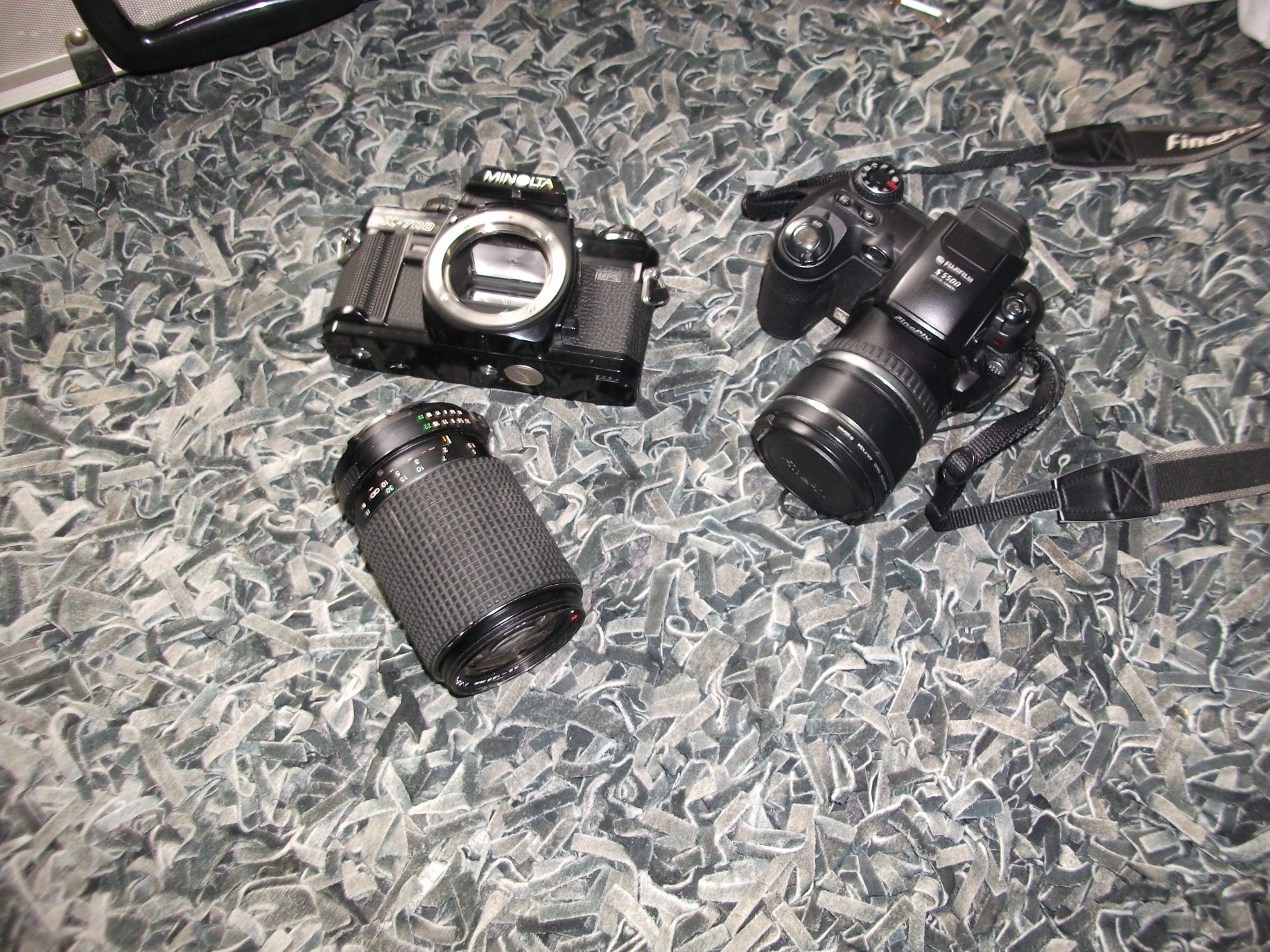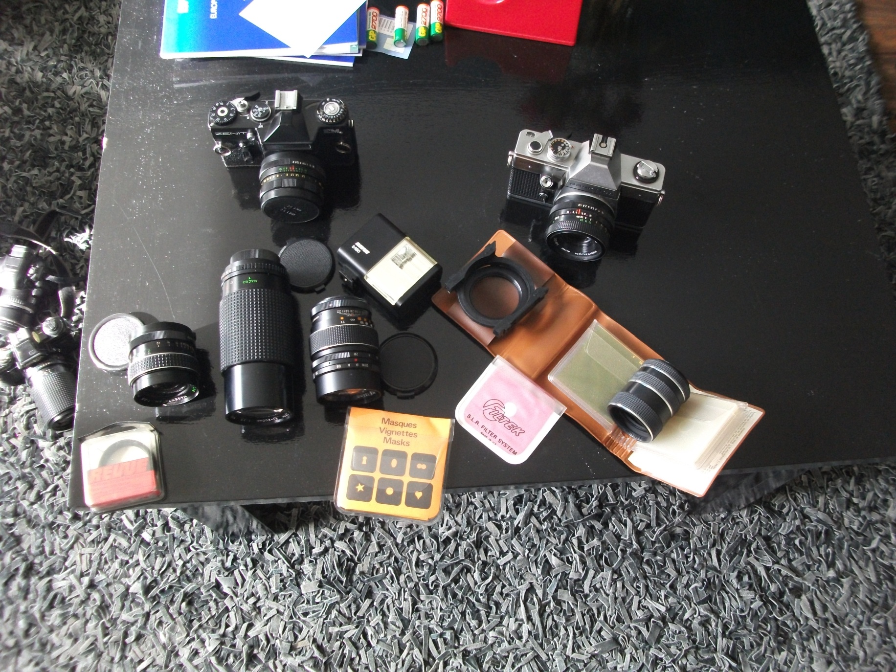 In de klep zitten wat Ilford zwartwit rolletjes en kruitvat kleur hehe, en de zonnekap van de 20mm die abnormaal nutteloos overkomt.