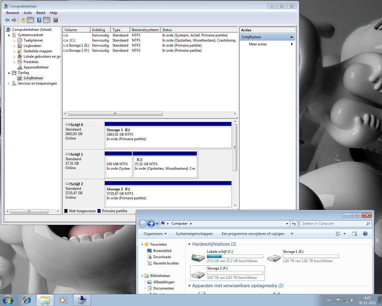 Ik zou de partities van je beide schijven weggooiden en opnieuw aanmaken, buiten windows natuurlijk. Waarschijnlijk is de schijf die nu 4TB aangeeft je eerste schijf geweest in het array.