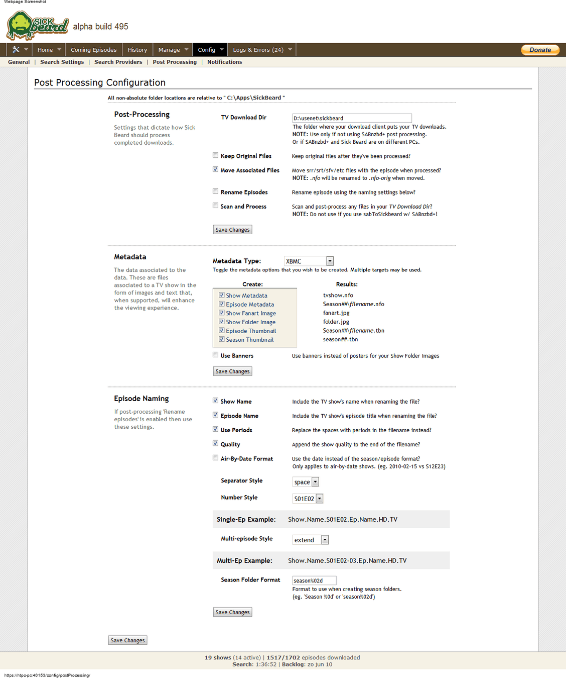 In sab heb ik netjes de SabToSickbeard script ingesteld voor alles met categorie "tv". Vergeet niet je "autoProcessTV.cfg" aan te passen. Deze wordt meegeleverd met de SabToSickbeard script. Hierin staan de details waar hij je Sickbeard kan vinden (URL, SSL, user/pass etc).