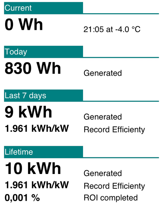Current (NaN Watt) klopt niet, en de 11 kWh lifetime klopt ook niet helemaal want dat is 213 kWh.